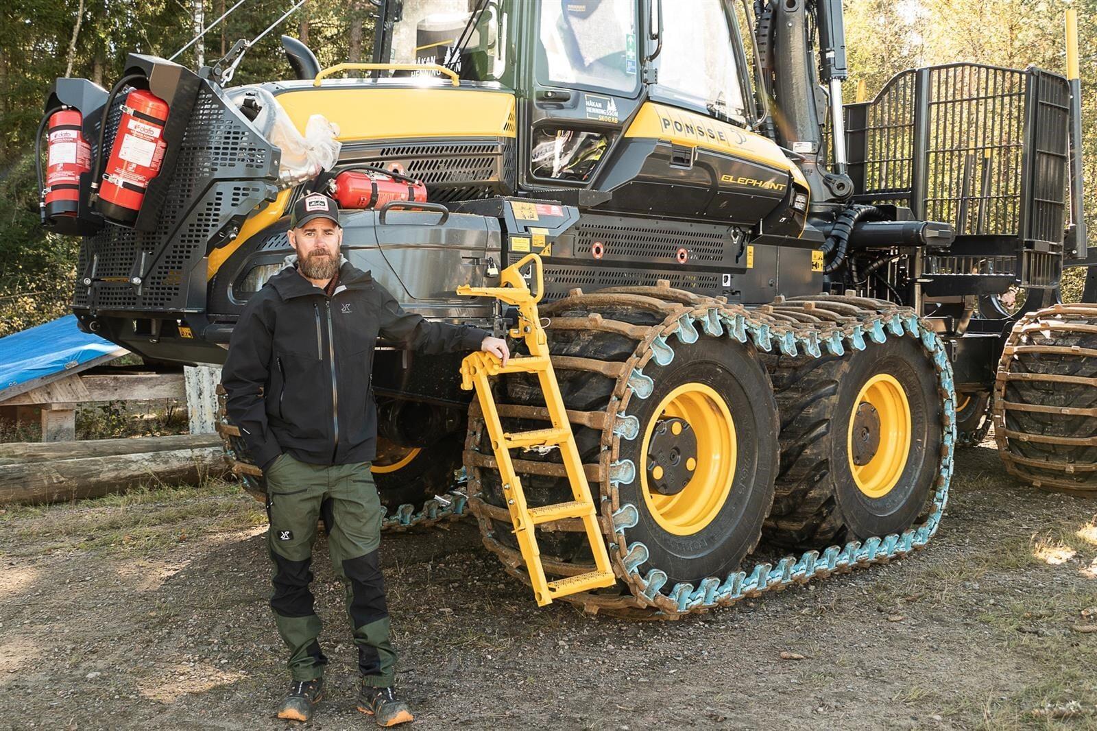 ”Det här är ett ypperligt bra tillfälle att träffa Ponsse och deras kunder. Nytt i vårt sortiment är en bärande bandplatta. Vi har spetsat till formen och tagit fram något nytt för branschen som vi tror mycket på. På skogssidan ser vi en bra ökning i försäljningen, och vi gör vårt bästa för att ta större marknadsandelar i landet”, säger Magnus Andersson, vd på Pewag Sweden. Foto: Ausrine Öhrström